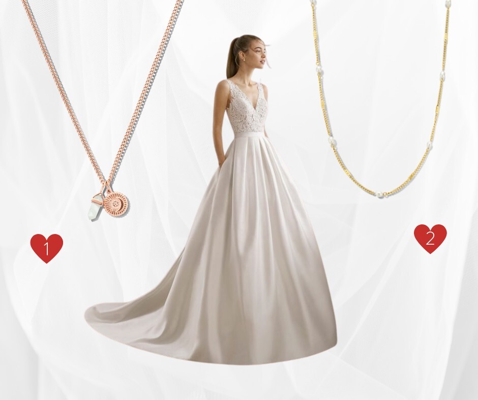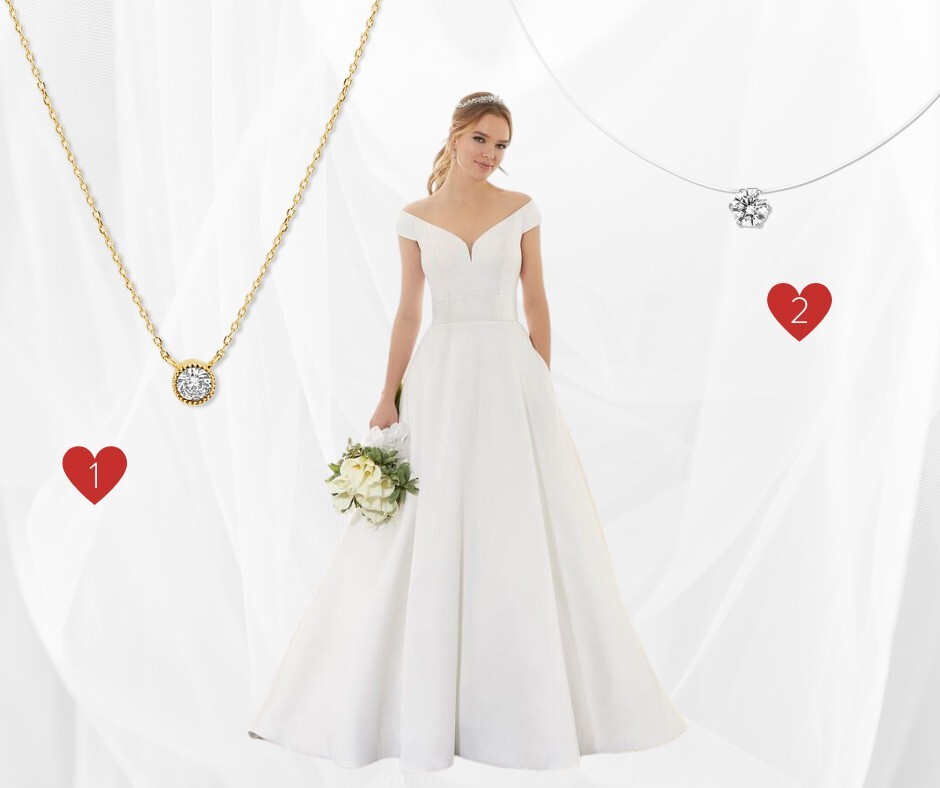 Pour une robe de mariée bustier, tous les bijoux sont permis! Collier rond, en pointe, ras-du-cou, tu as le choix alors fais-toi plaisir!